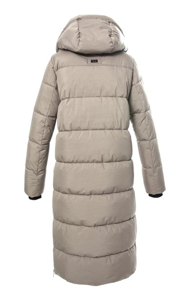 Dámský dlouhý vyteplený funkční kabát s kapucí v moderním prošívaném péřovém designu. kabát je vyroben z příjemného měkkého materiálu a má oboustranný zip a dvě kapsy vpředu, zipy na bocích a návleky v rukávech pro větší komfort,