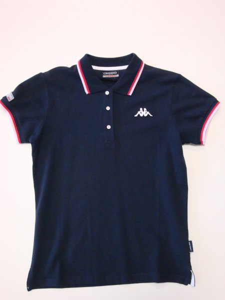 Dámské triko s límečkem, kontrastní proužek na límečku a na rukávech, vyšité logo, užší střih.